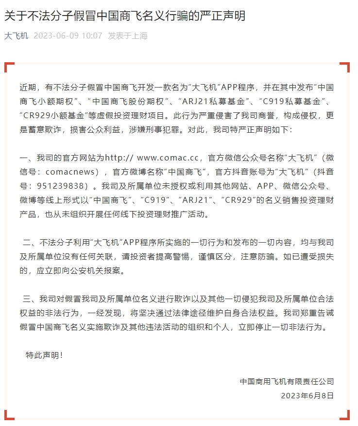 6月9日,中国商用飞机有限株连公司微信公众号“大飞机”发布《对于违规分子假冒中国商飞方法行骗的严正声明》。