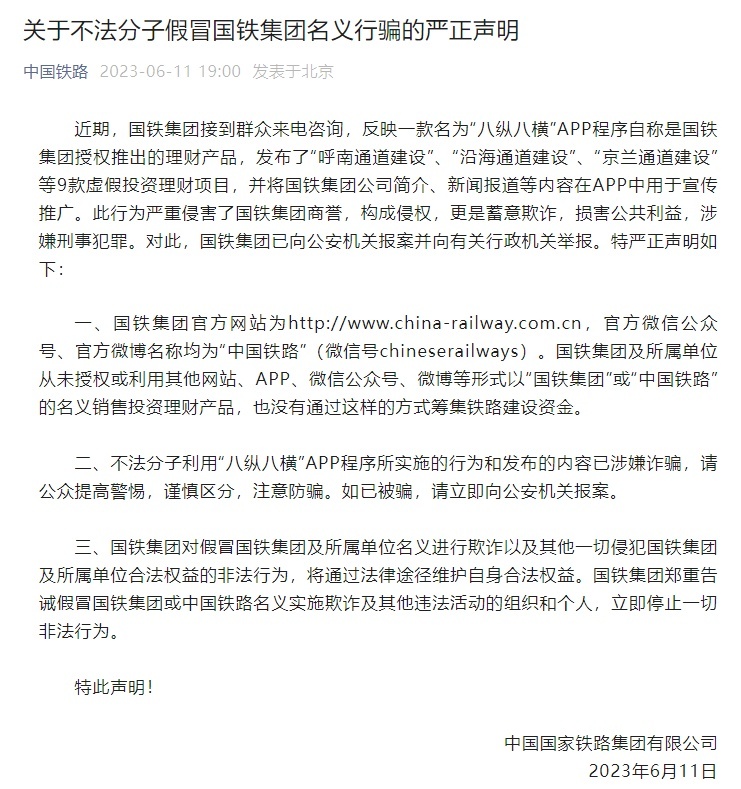6月11日,中国国度铁路集团有限公司微信公众号“中国铁路”发布《对于违规分子假冒国铁集团方法行骗的严正声明》。