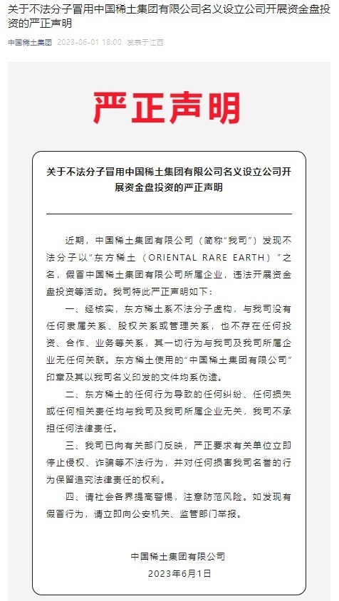 声明称,近期,中国稀土集团有限公司发现违规分子以“东方稀土(ORIENTAL RARE EARTH)”之名,假冒中国稀土集团有限公司所属企业,监犯开展资金盘投资等算作。