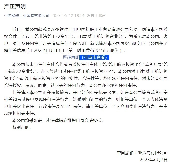 6月12日,中国船舶工业交易有限公司微信公众号发布《严正声明》。